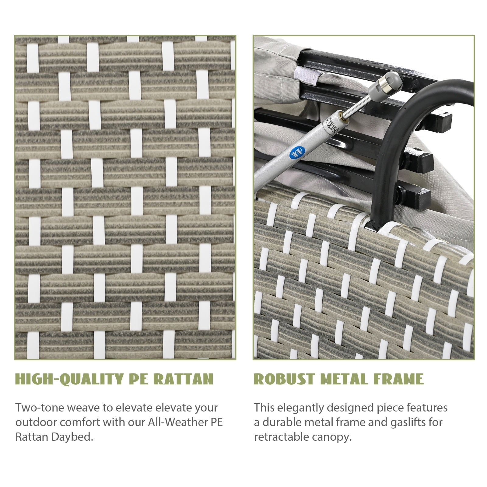 • [All-Weather Elegance & Durability] Experience year-round outdoor luxury with our beautifully crafted rattan daybed, designed to withstand all weather conditions. Made from high-quality PE rattan woven over a robust metal frame, this daybed combines elegance with resilience. The two-tone weave adds a contemporary flair, making it a stylish addition to any outdoor space. Its durability ensures that your investment remains as stunning as the day you bought it, regardless of the weather.